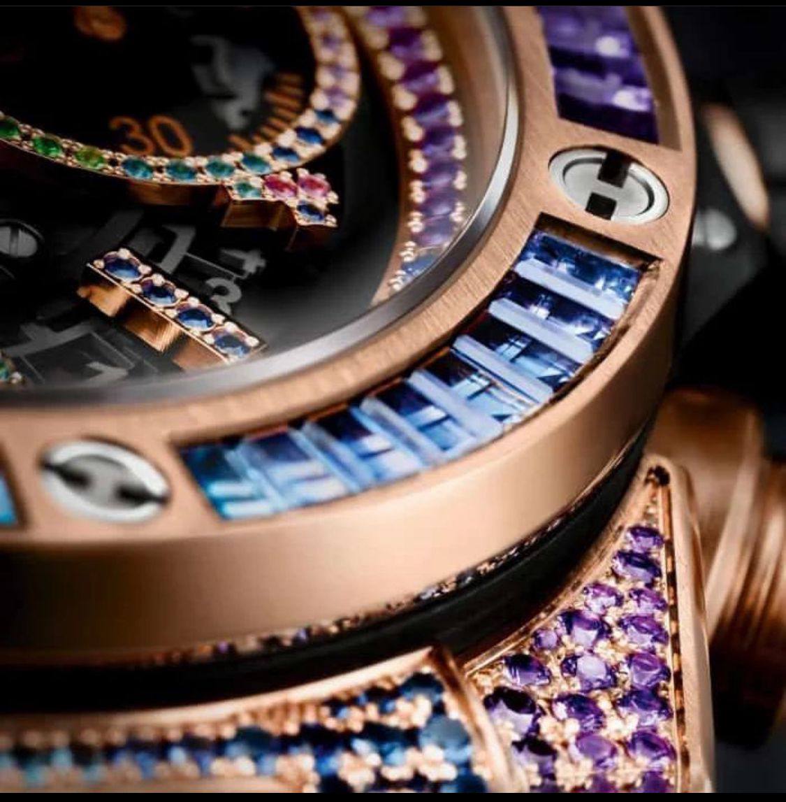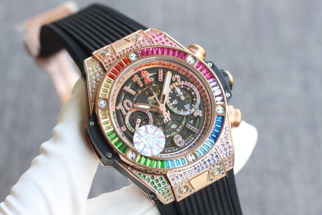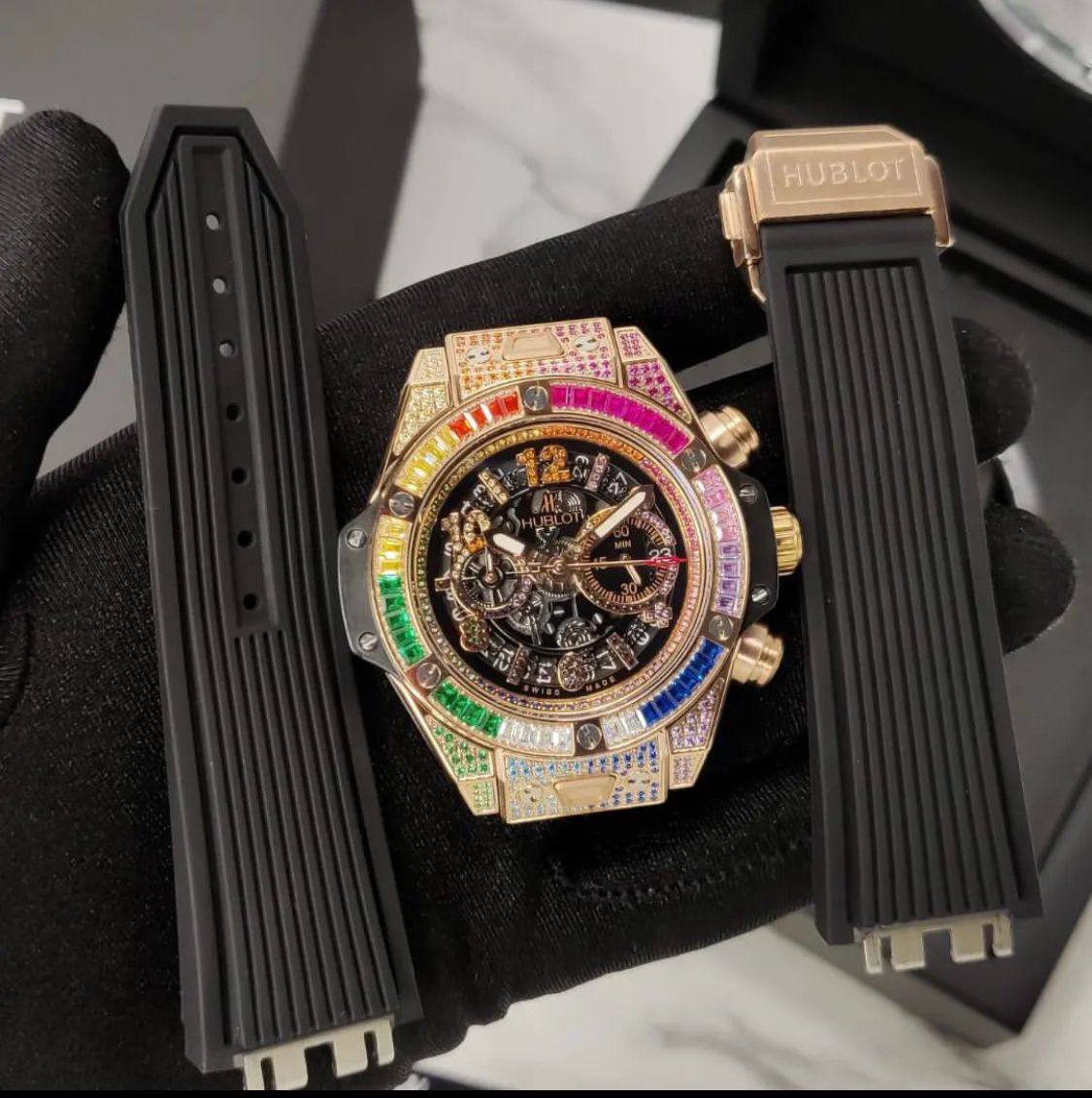 👉🏽 Features: Powered by original Japanese quartz machinery, Stainless-steel Rose gold broad studded case with H-Screwed fixed baguette bezel, Anti-reflective sapphire glass on a black rainbow 🏳️🌈 dial with stopwatch chronograph sub-dials, fastened by a high grade black detachable silicone strap with a deployment clasp.