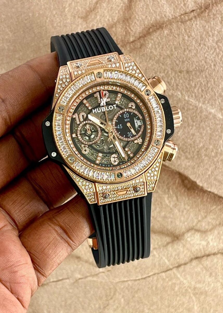 👉🏽 Features: Powered by original Japanese quartz machinery, Stainless-steel rosegold broad studded case with H-Screwed fixed baguette bezel, Anti-reflective sapphire glass on a grey dial with stopwatch chronograph sub-dials, fastened by a high grade black detachable silicone strap with a deployment clasp.