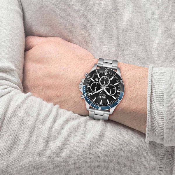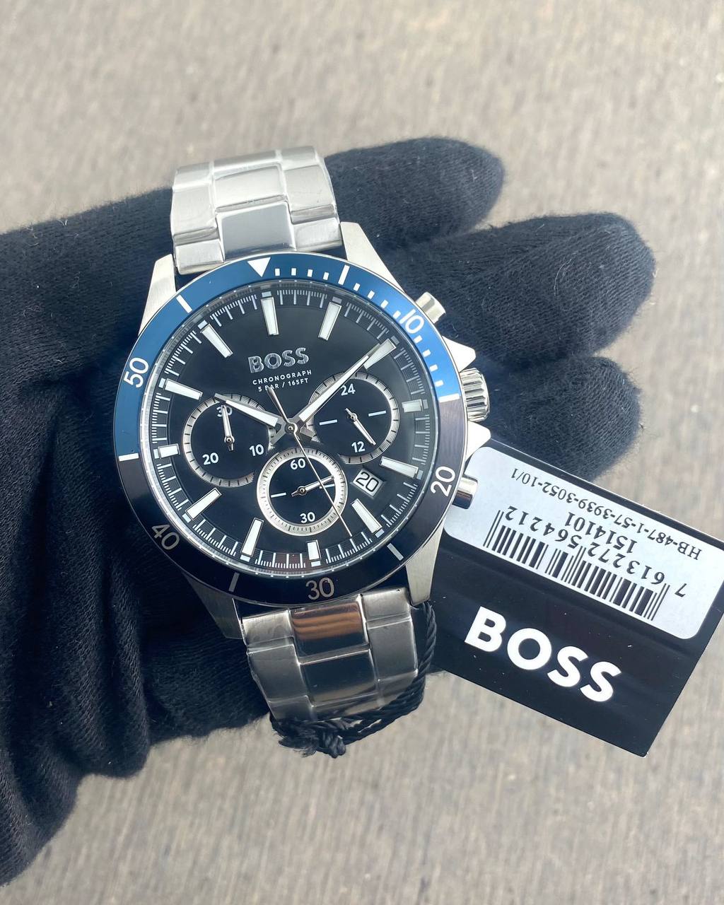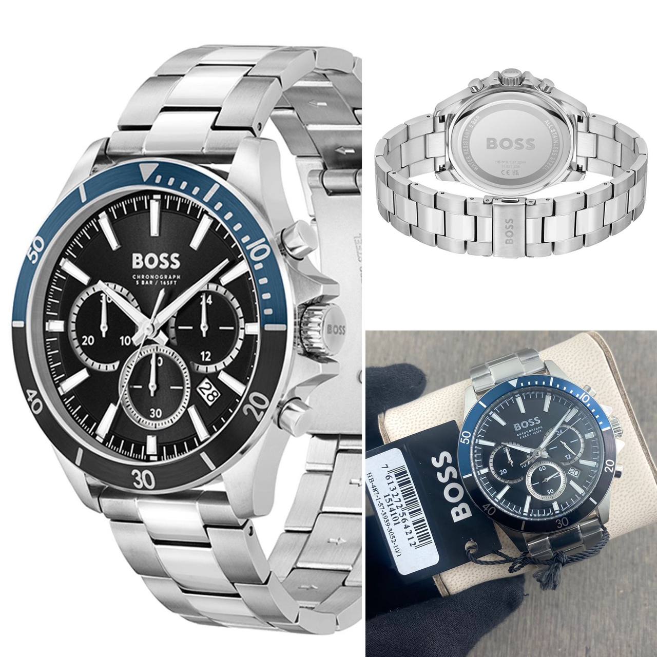 *Push yourself beyond your own limits to perfect your performance. The BOSS Velocity is for those who strive day after day to beat the best of the best. This stylish sports chronograph features a 44mm silver Stainless steel Plated case, Blue redy bezel, Black dial, Silver metal Blet with BOSS branding and BOSS buckle.