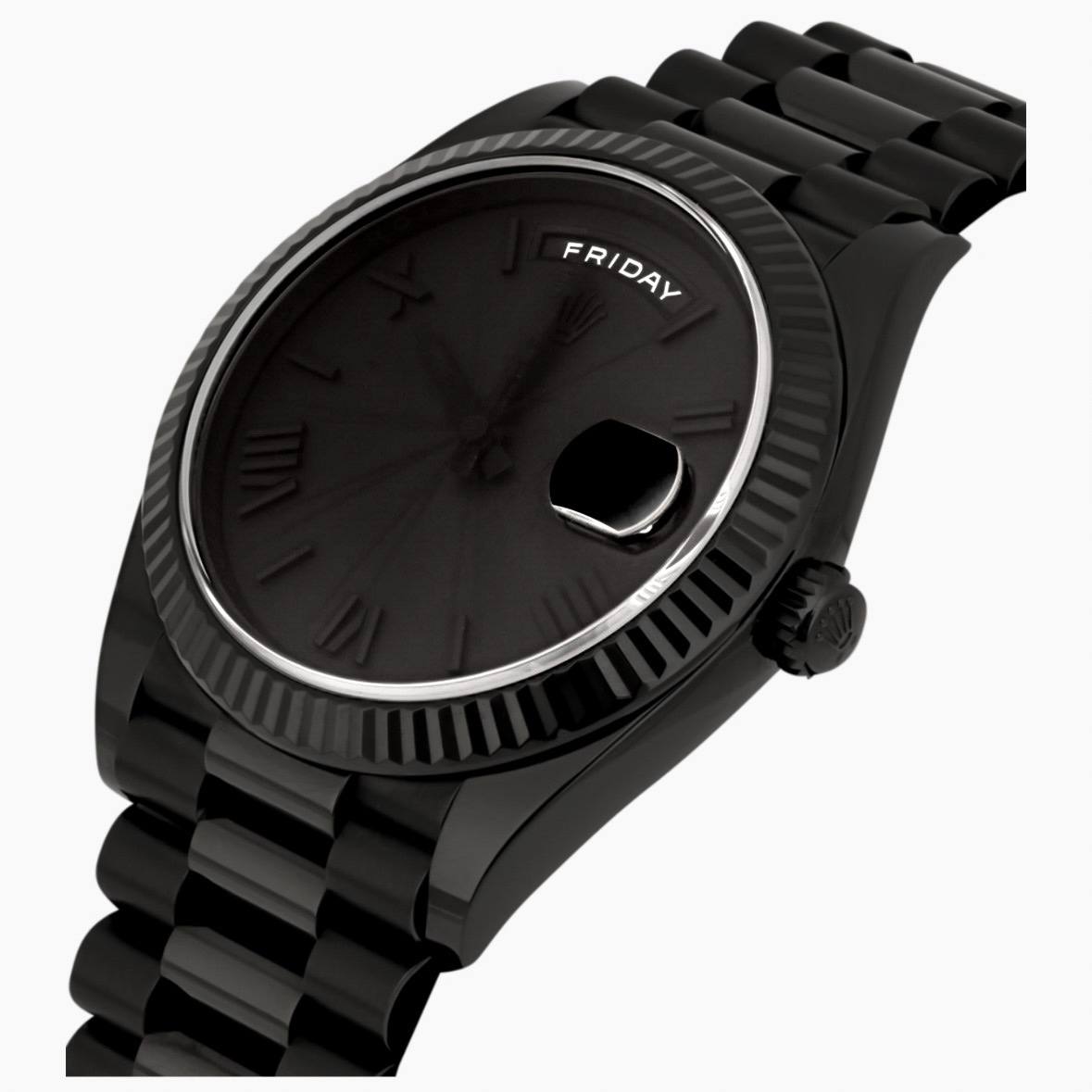 Date Indicator. Stainless Steel Black bezel and & Matte Black Case, Sapphire glass On A Black dial with Roman indices and hands, fastened by Stainless Steel Three Link Black President chain with original Rolex Clasp lock.